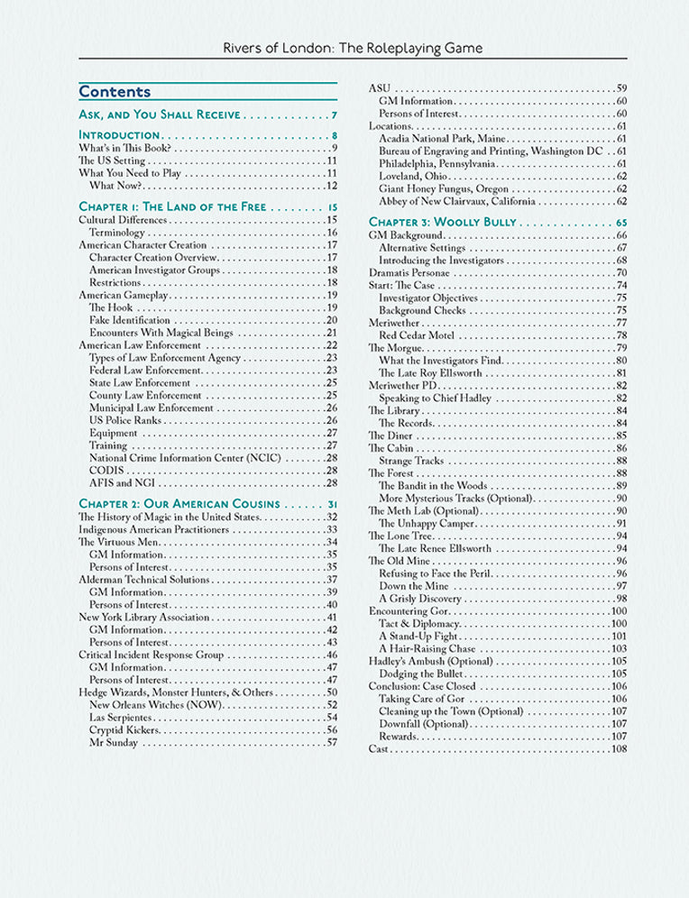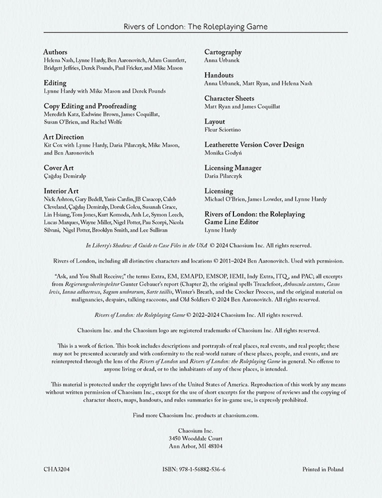 Rivers of London: In Liberty’s Shadow - A Guide to Case Files in the USA is a sourcebook for Rivers of London: the Roleplaying Game, based on the Rivers of London series by Ben Aaronovitch. The book also contains an exclusive piece of microfiction by Aaronovitch, “Ask, And Ye Shall Receive.”