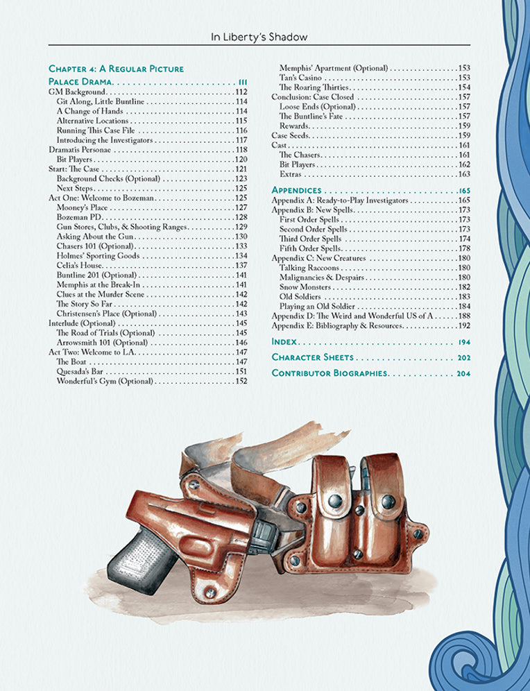 Rivers of London: In Liberty’s Shadow includes new spells, character creation options, and creatures unique to the USA setting. The book also includes six ready-to-play American investigators—members of the monster-hunting streaming channel, The Cryptid Kickers.